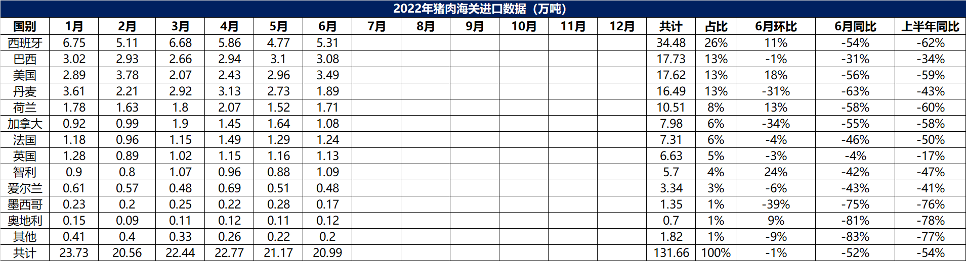 2022年6月中國主港豬肉進(jìn)口量20.99萬噸,環(huán)比下降1%,同比下降52%。1-6月中國主港豬肉進(jìn)口總量131.66萬噸,與去年同期相比減少54%。從進(jìn)口國別看,1-6月,從西班牙進(jìn)口的豬肉量依然高居首位,共計(jì)34.48萬噸,占進(jìn)口總量的26%。從巴西、美國、丹麥進(jìn)口的豬肉量各占進(jìn)口總量的13%。