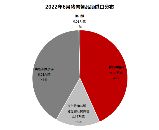 從進(jìn)口豬肉品項(xiàng)看,6月,其他凍豬肉進(jìn)口量9.08萬噸,占比43%。其他凍豬雜碎進(jìn)口量8.68萬噸,占比41%。主塊肉和脂肪的進(jìn)口量僅占到16%。