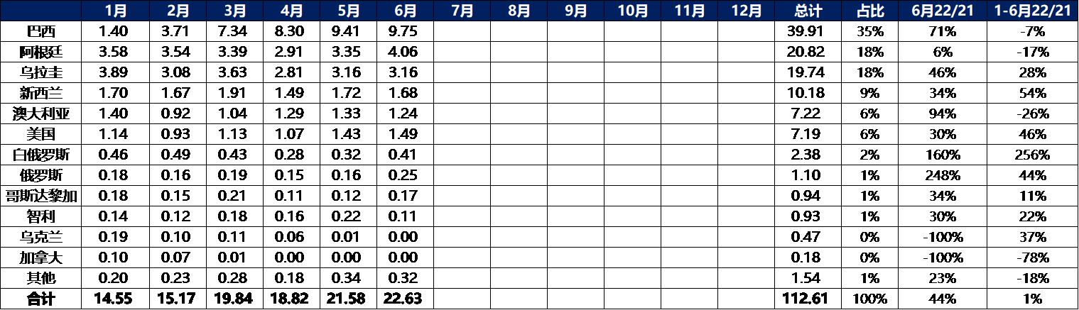 2022年6月中國主港牛肉進(jìn)口量22.63萬噸,環(huán)比+4.9%,同比+44%。1-6月中國主港牛肉累計(jì)進(jìn)口量112.61萬噸,與去年同期相比+1%。從進(jìn)口國別看,巴西仍然是最大進(jìn)口來源國,從巴西進(jìn)口量占比達(dá)35%,前五大進(jìn)口來源國為巴西、阿根廷、烏拉圭、新西蘭、澳大利亞。