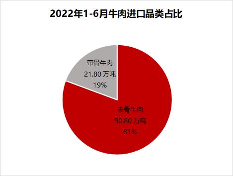 從牛肉進(jìn)口品項(xiàng)看,1-6月去骨牛肉進(jìn)口量90.8萬噸,占比81%。帶骨牛肉進(jìn)口量21.8萬噸,占比19%。