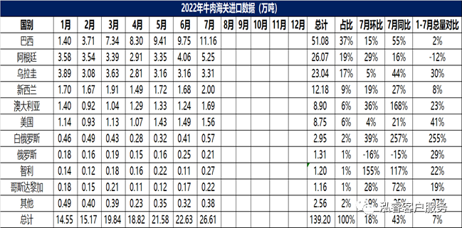 2022年1-7月冷凍牛肉進(jìn)口數(shù)據(jù)
