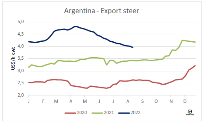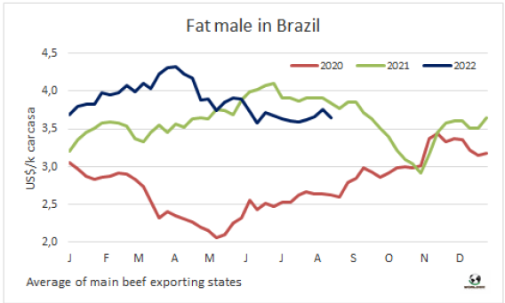 八月前十個(gè)工作日巴西出口量持續(xù)較大,出口價(jià)格下降。巴西外貿(mào)部報(bào)告前十個(gè)工作日巴西牛肉出口量達(dá)88806噸,平均出口價(jià)格6284美元/噸,平均出口價(jià)格較七月下降了4%,較六月的最高點(diǎn)下降了8%。如果保持前兩周的出口節(jié)奏,八月巴西牛肉出口量將達(dá)20萬噸,較2021年八月增加超2萬噸,也將創(chuàng)歷年八月出口量最高記錄。