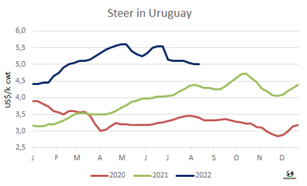 七月閹牛類型值連續(xù)兩周下跌,烏拉圭肉協(xié)報(bào)告每頭牛的閹牛類型值較上月下降了53美元,較五月的峰值下降了85美元。閹牛類型價(jià)值是烏拉圭肉協(xié)對(duì)一頭520公斤重,出成率54%的閹牛及其串種屠宰后產(chǎn)生所有產(chǎn)品的銷售價(jià)格的預(yù)估。烏拉圭肉協(xié)稱閹牛類型值下降是由于其組成成分的價(jià)格,其中下跌最明顯的是牛雜碎、牛副產(chǎn)品和鮮牛皮下跌最明顯。而屠宰場(chǎng)的活牛采購價(jià)格較上月僅下跌了2美分至1550美元,因此工業(yè)附加值縮減了51美金/頭至235美元,因此工廠要想盈利必須覆蓋其他成本。