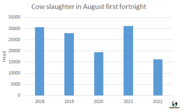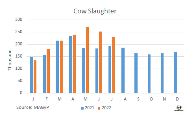 7月牛肉產(chǎn)量26.1萬噸,同比下降1.6%。7月人均消費(fèi)量達(dá)45公斤/人/年,比一年前下降了5.4%。2022年到目前為止,由于平均屠宰重量的增加,牛肉產(chǎn)量已達(dá)180萬噸,比2021年同期增加了近4%。因此前7個(gè)月的人均消費(fèi)量為46公斤/人/年。