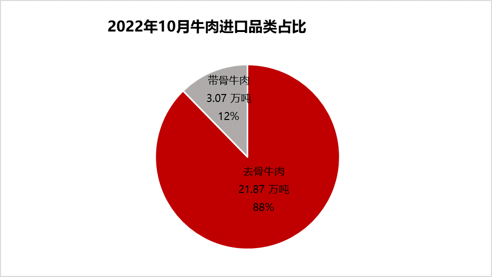 從進(jìn)口品項看,帶骨牛肉進(jìn)口量3.07萬噸,占比12%,去骨牛肉進(jìn)口量21.87萬噸,占88%。