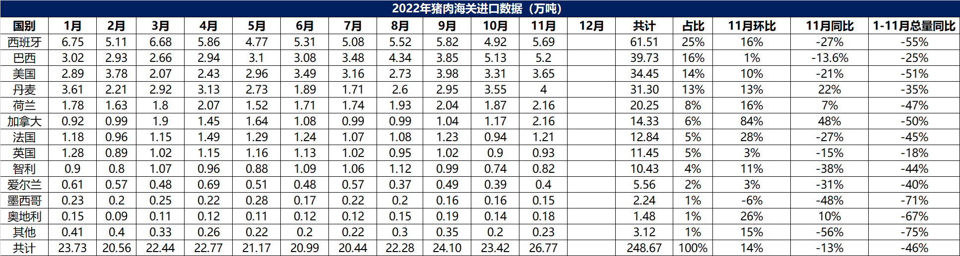 2022年11月中國主港豬肉進(jìn)口量26.77萬噸,環(huán)比增加14%,同比減少13%。1-11月中國主港豬肉進(jìn)口量共計(jì)248.67萬噸,同比減少46%。