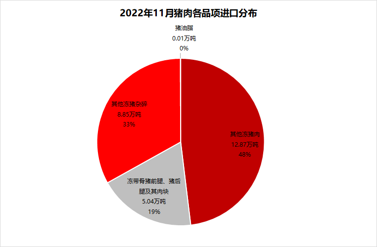 從進(jìn)口品項(xiàng)看,11月,其他凍豬肉進(jìn)口量12.87萬噸,占比48%;其他凍豬雜碎進(jìn)口量8.85萬噸,占比33%。豬主塊肉和豬油脂進(jìn)口量共計(jì)5.05萬噸,占比19%。