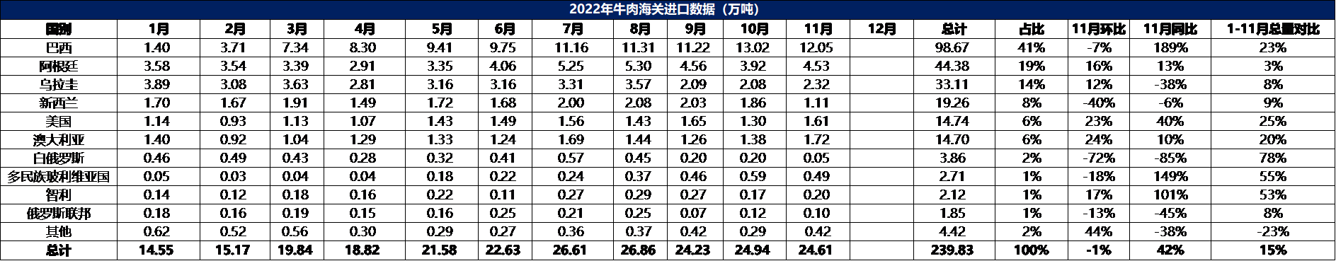 11月中國主港牛肉進(jìn)口量24.61萬噸,環(huán)比下降1%,同比增長42%。1至11月主港牛肉進(jìn)口總量239.83萬噸,同比增長15%。