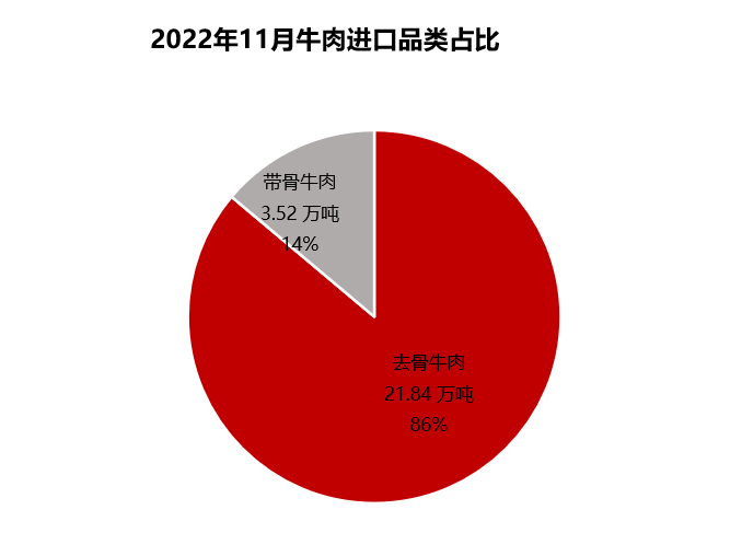 從進(jìn)口品項(xiàng)看,帶骨牛肉進(jìn)口量3.52萬噸,占比14%,去骨牛肉進(jìn)口量21.84萬噸,占比86%。