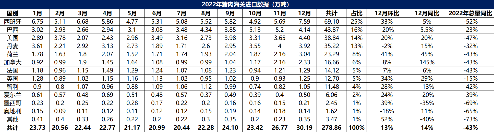 202212月中國主港豬肉進口量30.19萬噸,環(huán)比+13%,同比+14%。全年中國主港豬肉進口總量278.86萬噸,同比-43%12月豬肉前四大進口來源國依然是西班牙、巴西、美國、丹麥,分別占當月進口量的25%、16%、14%、13%