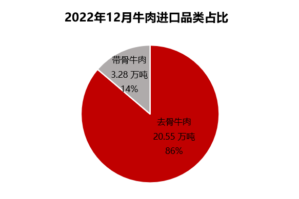 從進口品類看,12月去骨牛肉進口量20.55萬噸,占86%,帶骨牛肉進口量3.28萬噸,占14%