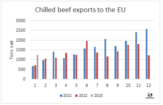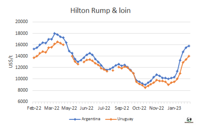 2023年開年至今希爾頓配額內冰鮮牛肉價格保持爆發(fā)式增長節(jié)奏。上周阿根廷臀腰肉參考價15500-16200美元/噸,烏拉圭產品參考價14000美元/噸,一些進口商擔心新冠疫情給市場帶來不確定性,本周初還價低于10000美元/噸,烏拉圭Marfrig的CEO上周表示歐洲市場表現(xiàn)出更強的活力,需求比幾個月之前更好了。