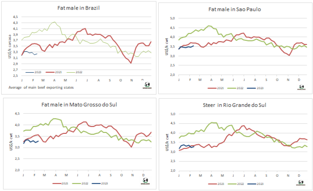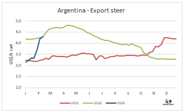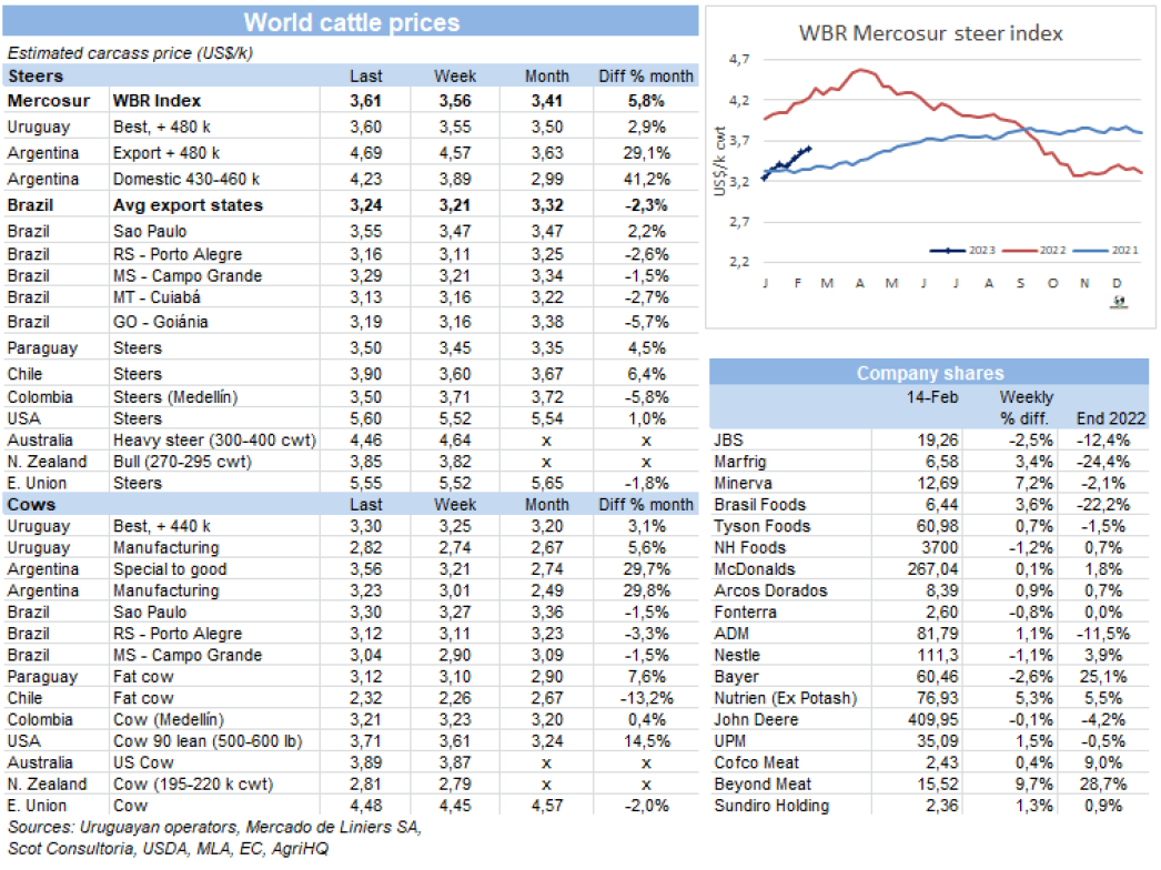 由于活牛價格急劇上漲,政府為控制不讓價格轉移到消費端者身上,給屠企施壓。周一政府重新啟動了一項“關愛肉”計劃,通過該計劃,企業(yè)必須承諾以低于當?shù)厥袌?span>30%左右的價格分銷七項部位肉。昨天,也就是周二,新加一項要求是這些公司必須每月貢獻1.5萬噸的部位肉。由于牛肉是食品和飲料類別中權重最大的商品,占消費者價格指數(shù)(CPI)的24%,經濟部希望能影響2月的通貨膨脹率。與此同時,政府還對海關和聯(lián)邦公共收入管理局施加壓力。政府發(fā)布的一份報告稱,他們發(fā)現(xiàn)“在2021年至2022年期間,523份牛肉出口許可證存在虛開發(fā)票的操作”。報告指出,此類操作涉及22家出口商,“少開發(fā)票”的總額為1190萬美元(占這兩年出口額的0.2%)。一些公司本周無法獲得出口許可。此外,已經廢除的2021年6月開始實施的肉類出口配額也被恢復。這一配額最初為2.9萬噸,并加上關稅配額,后來變得更加靈活,達3.9萬噸,而現(xiàn)在又回到了原來的數(shù)量。就此而言,為了讓國內市場獲得便宜的肉類,出口企業(yè)正在讓步,例如將針扒和肩胛排除在出口禁令之外,建立一個特殊的牛肉出口用匯率——比官方匯率高出1美元,以及只允許擁有屠宰場的公司授予出口許可證等其他要求。