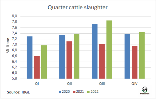 2022年巴西牛屠宰量2970萬頭,比2021年的2770萬頭增長了近200萬頭(+7.1%),而2021年是當前牛周期的生產下限。全年牛肉產量增長了6.5%,達794萬噸。這是自2019年以來的最大產量。