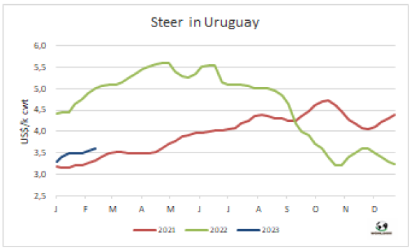 牛屠宰量連續(xù)五周增長,許多工廠為481配額加緊備貨。據(jù)烏拉圭肉協(xié)報告,截止一周內牛屠宰量52432頭,較前一周增加了635頭,僅低于去年同期1200頭。481配額屠宰表現(xiàn)在閹牛的屠宰占比增大上。閹牛屠宰量29412頭,占總屠宰量的56.1%,與上周持平。小母牛屠宰量7456頭,較上周增長了2%,母牛屠宰量14824頭,較上周增長了3%。上周屠宰量最活躍的工廠是Las Piedras(379廠,5700頭),Marfrig-Tacuarembó (12廠,屠宰量5096頭),Minerva-pulsa(7廠,屠宰量4021頭)。美麗華3家工廠屠宰量10051頭,較上周增加了580頭。2月前11個工作日牛屠宰量共88260頭,較2022年同期減少了5.7%,1月屠宰量同比下降了27.8%。