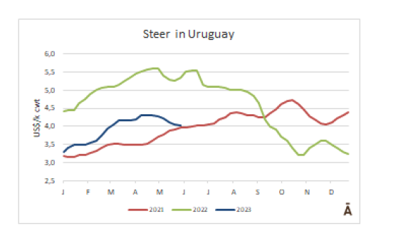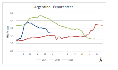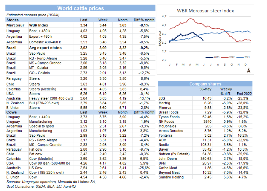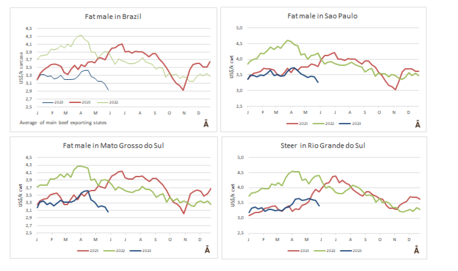 cwt,跌至1月以來(lái)最低水平。由于巴西價(jià)格大跌(-8%),加上巴西貨幣雷亞爾的貶值,巴西出口州的平均牛價(jià)由$3.09/kg cwt跌至$2.92/kg cwt。烏拉圭和阿根廷的市場(chǎng)的價(jià)格下降幅度要小得多。