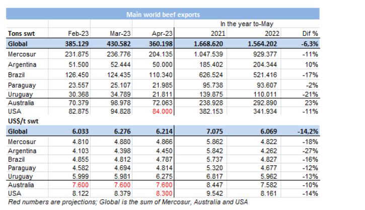 參考價(jià)格為:巴西牛腱子$5,200,前部位肉$4,800,$90VL掠奪牛前3,800;烏拉圭肩胛背肩$4,300,后部位肉$5,400,前后腱$6,000,80VL碎肉$3,200,牛肋排$5,700;阿根廷母牛六分體$4,300, 80VL碎肉$3,200。