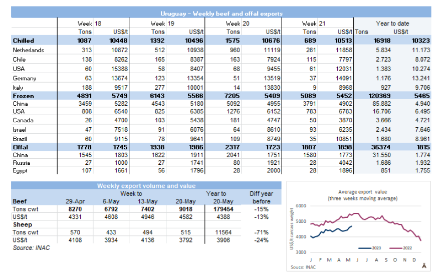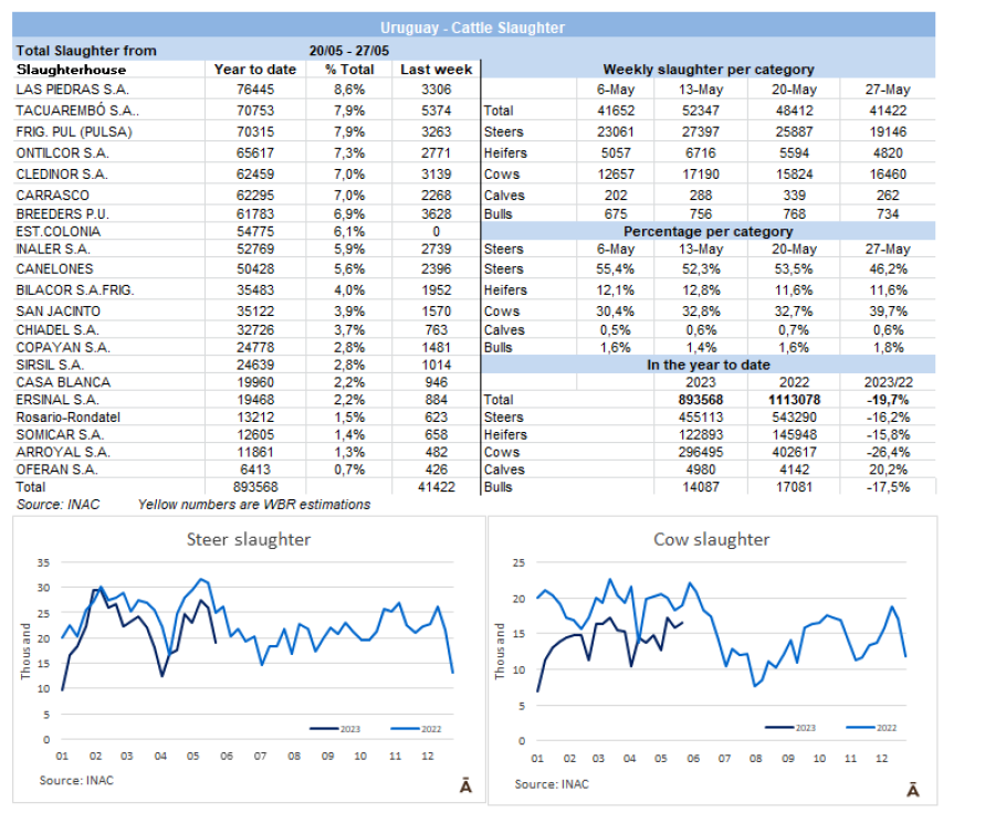 據(jù)INAC報(bào)告,上周牛的屠宰總量為41422頭,環(huán)比降低14.4%(大約7000頭牛)。由于481配額屠宰的結(jié)束,閹公牛明顯減少,從25,887頭下降到19,146頭。相反,母牛增加了近1000頭,保持在16460頭,而小母牛則下降到4820頭。