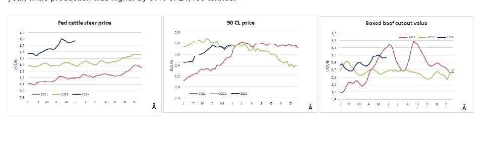 同時(shí),巴西的9切的前部位肉的交易價(jià)格為$5,100-$5,200,巴拉圭的交易價(jià)格為$5,200-$5,400,交易量很低。這兩個(gè)國(guó)家的80VL碎肉的參考價(jià)格為$3,200-$3,300。
