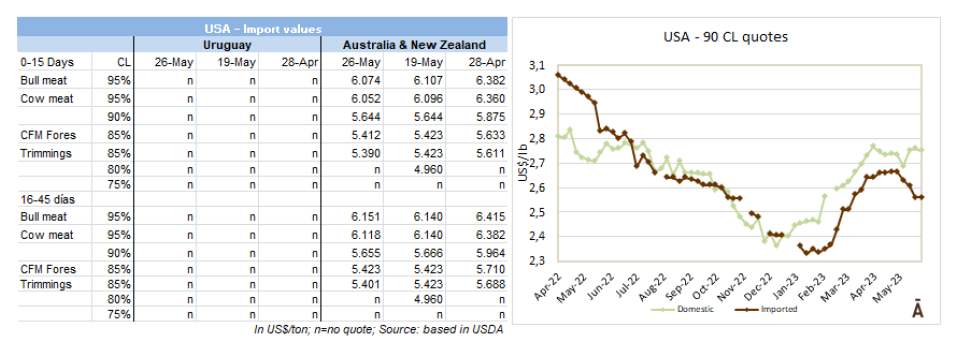 總體來(lái)說(shuō),近幾周美國(guó)進(jìn)口市場(chǎng)調(diào)整幅度較小。盡管澳大利亞在供應(yīng)量充足,但價(jià)格還是下降了100-200美元/噸。巴西的配額外96CL前部位肉價(jià)格為$4,300,90CL為$4,000-4,100美元之間,這些價(jià)格比中國(guó)今天提供的價(jià)格更有吸引力。