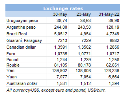 大家都注意到22-26周的智利市場(chǎng)更加活躍,這幾周把整個(gè)6月的訂單量都完成了。巴西的19/20切價(jià)格在$5,600-$5,700(CIF)。巴拉圭19/20切的價(jià)格在$5,800-$5,900美元。