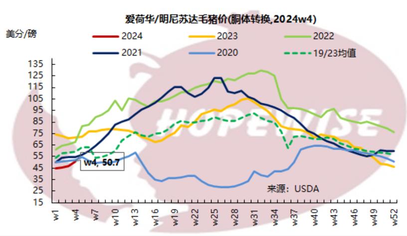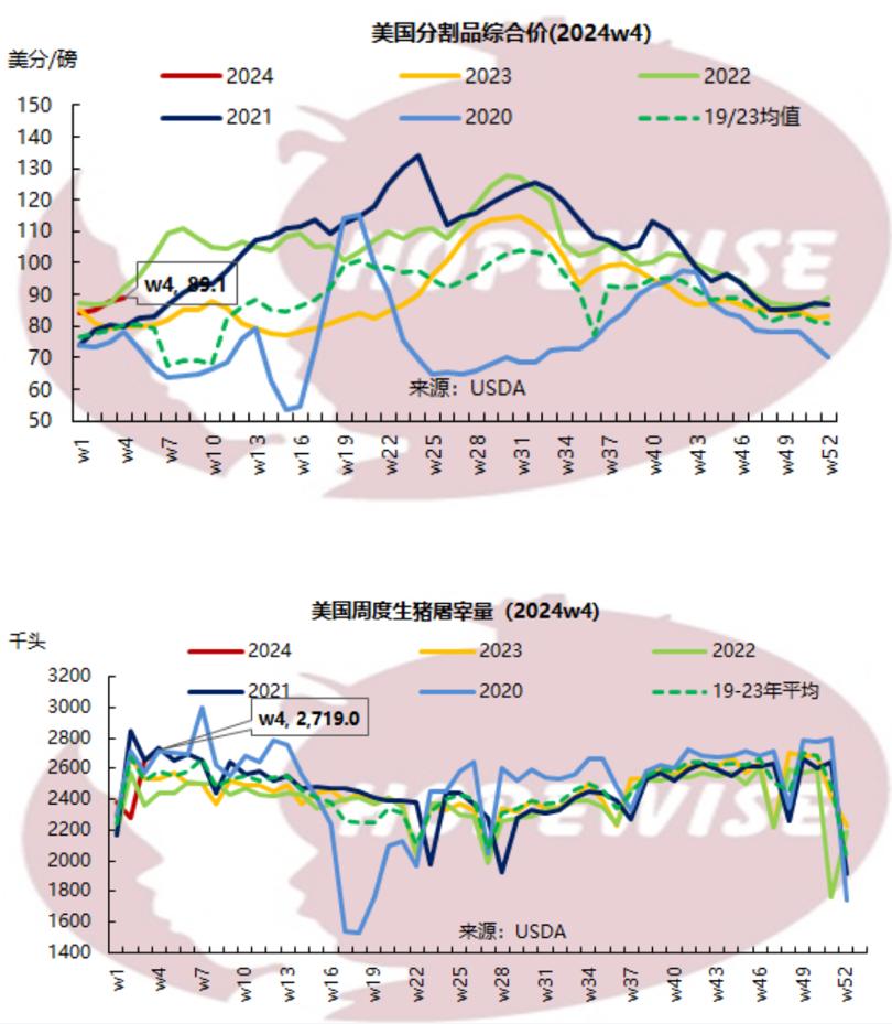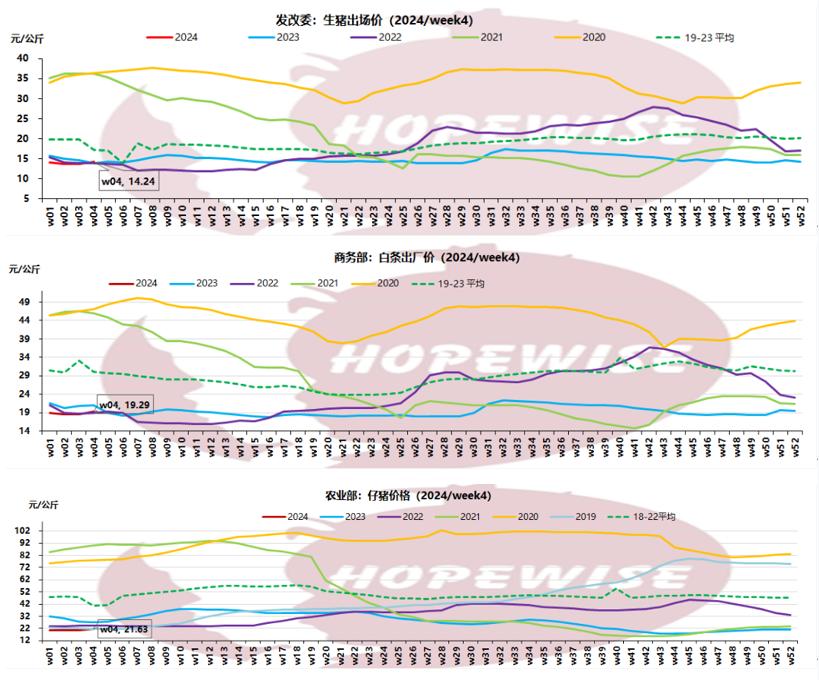 2024 年第 4 周活豬價(jià)格為 14.24 元/公斤,與上周相比上漲 3.9%,但與去年同期相比下跌 7.59%。胴體價(jià)格為 19.29 元/公斤,與上周相比上漲 4.3%,但與去年同期相比下跌 8.7%。受新一輪雨雪天氣影響,南方市場(chǎng)的運(yùn)輸受到一定阻礙。本周初,全國(guó)豬肉價(jià)格上漲超過(guò) 14.5 元/公斤。然而,豬價(jià)上漲后,終端客戶的后續(xù)需求疲軟。市場(chǎng)對(duì)未來(lái)上漲的預(yù)期減弱,導(dǎo)致養(yǎng)豬積極性下降。臨近周末,豬肉價(jià)格再次出現(xiàn)窄幅調(diào)整。