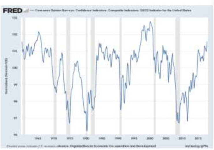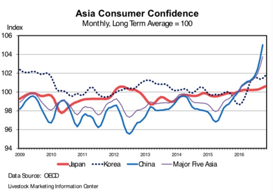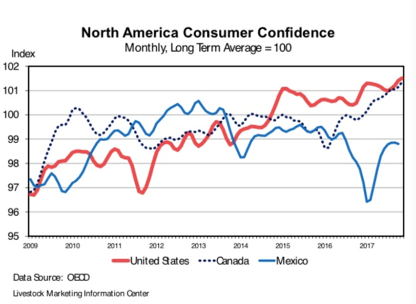 消費(fèi)者信心與經(jīng)濟(jì)增長密切相關(guān),相對強(qiáng)勁的數(shù)字預(yù)示著紅肉需求量的增長。在最近六年里,美國消費(fèi)者信心趨勢走高。美國消費(fèi)者信心指數(shù)(CCI),被作為經(jīng)濟(jì)合作與發(fā)展組織(OECD)的標(biāo)準(zhǔn)和指標(biāo),可見下附圖表1。該圖表來自圣路易斯聯(lián)邦儲備銀行數(shù)據(jù)庫(弗萊德,數(shù)據(jù)截止到2017年10月)。經(jīng)濟(jì)合作與發(fā)展組織(OECD)11月的美國消費(fèi)者信心指數(shù)(CCI)為101.5,是自2000年12月以來最高的一個(gè)月。2009年2月,是上次經(jīng)濟(jì)衰退的最低點(diǎn),美國消費(fèi)者信心指數(shù)(CCI)為96.7.