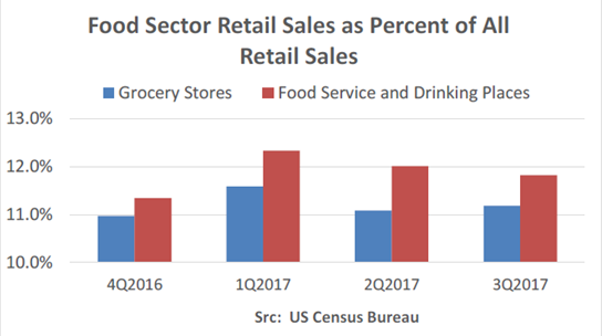 自2008-2009年經(jīng)濟(jì)大衰退以來,牛肉需求的艱難表現(xiàn)使零售銷售在食品行業(yè)增長節(jié)奏非常之緩慢。11月的零售店銷售額較上年同期增長了3.4%,但由于今年頭兩個(gè)月和六月與七月的增長乏力,今年的銷售額可能不會超過1.5%。餐飲服務(wù)零售增長趨勢敲響了更重的警鐘。 11月餐飲服務(wù)的銷售增長同比只有2.5%,10月只有1.5%。和2015年的8%和2016年的6%的增長相比,2017年,餐飲服務(wù)銷售較去年增長只有2.3%,