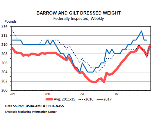 2017年生豬屠宰量依然跟隨著季節(jié)性模式。在2017第四季度年同比增加也是通常的典型情況,并高于同期前幾個(gè)月水平。11月和12月上半月溫和的中西部天氣能有利于提高育肥重量。生豬重量在2016年年底出現(xiàn)異常,年同比并沒有增加(或者說是相較于前5年的平均水平也沒有增加,請(qǐng)見圖表)。