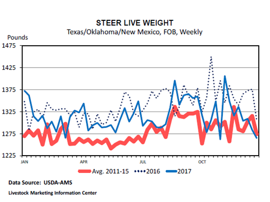 根據(jù)最新數(shù)據(jù),牛的育肥重量在2016年最終有一次上浮,部分原因是從11月到12月溫和的天氣。作為提醒(在今天日?qǐng)?bào)里的一個(gè)部分也提及到),2017年年初育肥牛的重量年同比下降不能都?xì)w結(jié)為惡劣的天氣。積極擴(kuò)張的市場(chǎng)營(yíng)銷也導(dǎo)致了這些下跌。但12月底幾個(gè)主要育肥場(chǎng)的所在地區(qū)天氣發(fā)生改變,極度寒冷的天氣突然到達(dá)美國(guó)中西部和一些其它地區(qū)。后附兩張育肥牛重量趨勢(shì)圖片相比, 顯然12月的年同比重量增加主要是在中西部和中部平原地區(qū)。近期極端寒冷的天氣主要集中在美國(guó)中部,預(yù)計(jì)國(guó)家育肥牛重量數(shù)據(jù)能很快體現(xiàn)出來。