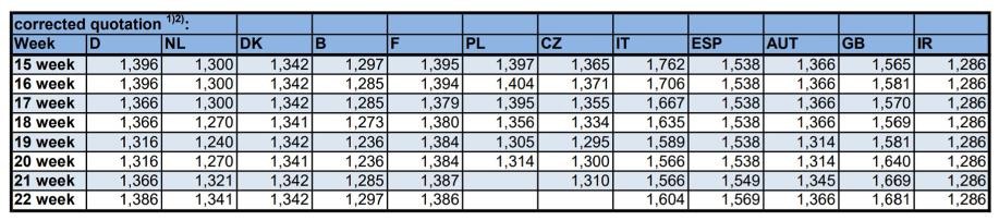 比利時(shí)和英國(guó)豬價(jià)上漲幅度相對(duì)較小,上漲幅度大概在 1 歐分左右。丹麥和法國(guó)豬 價(jià)不變。除了公眾假日以外,多起罷工對(duì)屠企正常產(chǎn)出造成影響。