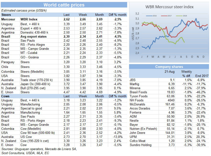 當(dāng)?shù)刎泿抛呷醭掷m(xù)影響活牛價(jià)格,以本地貨幣成交活牛的國(guó)家競(jìng)爭(zhēng)力增強(qiáng),南美共同市場(chǎng)閹牛指數(shù)本周又下跌了4美分到2.62美金/公斤,7月初以來(lái)最低。巴西雷亞爾對(duì)美金貶值了2.4%,阿根廷比索對(duì)美金貶值了1.2%,所以?xún)蓢?guó)美金牛價(jià)都下跌了4美分,巴西2.3美金/公斤,阿根廷2.53美金/公斤,烏拉圭市場(chǎng)形勢(shì)有所改變,猶太市場(chǎng)暫停,專(zhuān)注于481配額的谷飼牛肉生產(chǎn),巴拉圭牛價(jià)和上周一樣沒(méi)有變化。