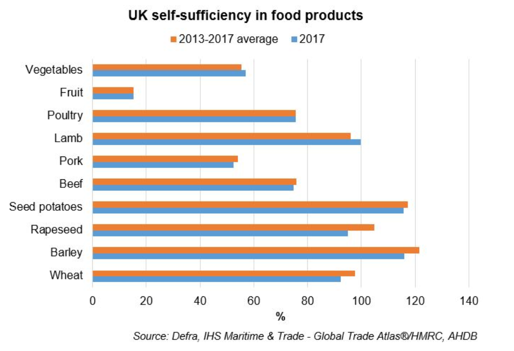 英國可以自給自足的食品有:羊肉、土豆、大麥。其他都依靠進口。