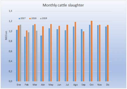 2019年第一個月牛只屠宰量超過前兩年,但是后面兩個月屠宰量同比下跌,三月只屠宰了101萬頭,第一季度總共屠宰312萬頭,同比減少5%。