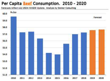 USDA在六月存欄報告出來之后對供應(yīng)/需求平衡表做了微調(diào),2019年預(yù)測牛肉產(chǎn)量調(diào)低了7500萬磅,主要原因是平均胴體重量比預(yù)期低,并且第三季度屠宰量也有下行的趨勢。產(chǎn)量的減少會被需求端的調(diào)整抵消一部分,進口量將增加1000萬磅,出口量會減少1000萬磅,此外人均牛肉消費量也被調(diào)低,僅會同比增長0.6%。不過USDA對2020年的預(yù)測數(shù)據(jù)并沒有進行調(diào)整,而且雖然牛肉供應(yīng)量將減少,USDA還是把2019年閹牛價格預(yù)測調(diào)低了1.3%。