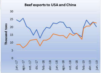 2019/20農(nóng)業(yè)年前兩周阿根廷工廠已經(jīng)發(fā)運了1847噸希爾頓牛肉,比巴拉圭全年發(fā)運的量還多一倍,也達到了烏拉圭配額量的30%,不過還需要觀察在國際價格下跌、對美元匯率貶值以及本地消費減少的情況下市場會如何發(fā)展。