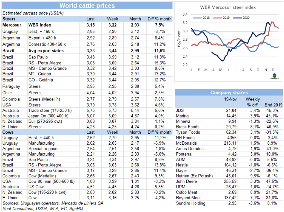 上周牛屠宰量繼續(xù)增長,達2018年三月至今兩年半以來最大。烏拉圭肉協(xié)報道,截止11月21日活牛屠宰量較上周上漲了2200頭,達54491頭,較去年同期增長了7600頭。工廠正在為481配額全負荷生產(chǎn),閹牛屠宰量28749頭,較上周增長了4031頭,達2018年三月第二周至今以來最大。小母牛屠宰量806頭至8364頭,母牛屠宰量下降了2500頭,下降至16451頭。本周屠宰量最高的工廠是Las Piedras(5120頭),Marfrig-Tacuarembo(4532頭)和Athena-Pulsa(4377頭)。Marfrig四家工廠屠宰總量14838頭,較上周略有增加,美麗華兩家共廠屠宰量8049頭,較上周略有減少。11月截止21日,牛屠宰量151146頭,較2019年同期增加了3萬頭,本月屠宰量預計將達21萬頭,較去年增加2-2.5萬頭,連續(xù)第二月高于上年。