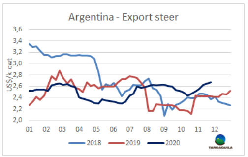 閹牛價格再次上漲,特種閹牛價格上周一周內(nèi)上漲了5-10比索,達214-218比索/公斤,串種閹牛價格上漲了10比索,成交價210-214比索/公斤,特優(yōu)母牛價格上漲了8比索至200-205比索/公斤,主要用于中國市場的工業(yè)母牛上漲了2-5比索,至185-190比索/公斤。