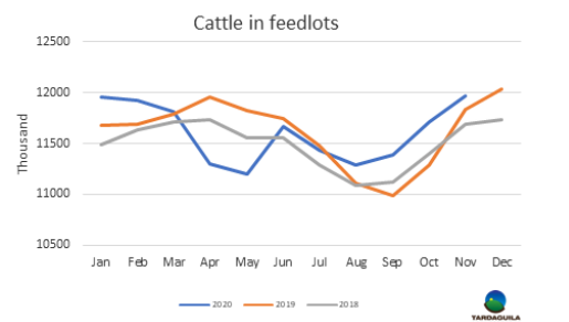 盡管歐洲需求下降,中國市場不順暢,近一個月用于出口的活牛價格仍然強勢上漲。近五周閹牛價格上漲了13%。一些分析人士觀察到,原因之一可能是通常在年底之前出于稅收便利的原因,飼育場往往將銷售推遲到第二年。另一方面是飼育場供應(yīng)問題。許多飼養(yǎng)場把育肥到一半的牛送回,以便將育肥階段拉長,以獲得更好的價格;目前的價格增長還不夠,育肥的損失仍然很大,所以他們試圖將銷售延后到圣誕節(jié)前后。