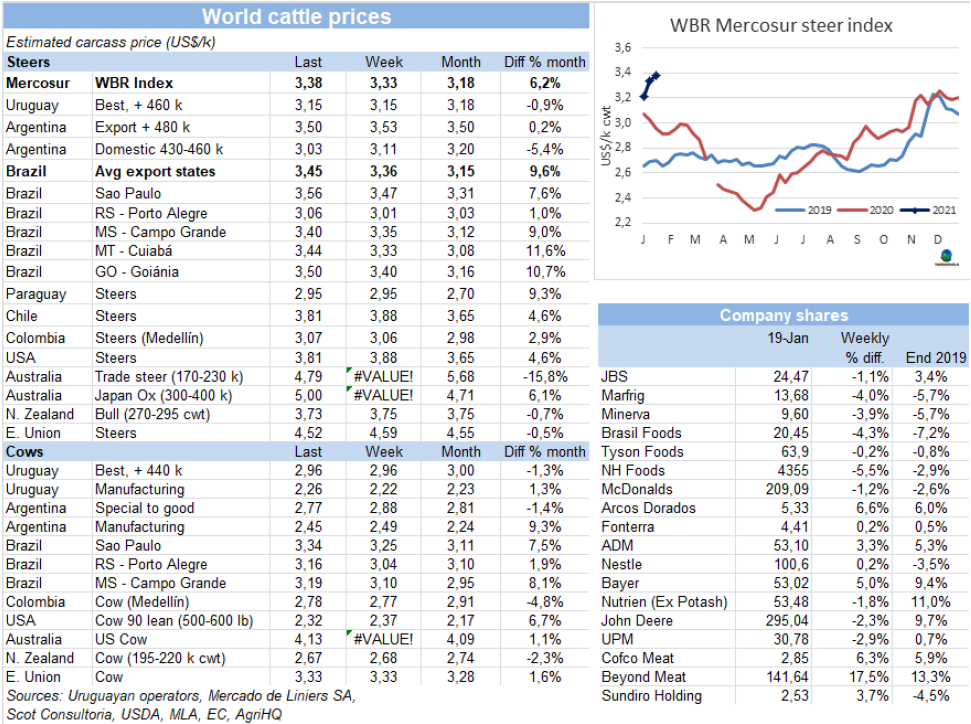 巴西育肥牛價格繼續(xù)上漲,主要出口地區(qū)育肥牛平均價格3.45美元/公斤,較阿根廷特種閹牛價格略低5美分。圣保羅等地區(qū)開始出現(xiàn)高于阿根廷的參考價。本周圣保羅育肥牛成交價3.56美元/公斤。巴西是南美地區(qū)唯一牛價上漲的國家,阿根廷按比索計牛價保持穩(wěn)定,美元牛價下跌了3美分至3.5美元/公斤。烏拉圭和巴拉圭保持上周的參考價,分別為3.15美元/公斤和2.95美元/公斤。本周南方共同市場閹牛價格指數(shù)上漲5美分至3.38美元/公斤,達2015年2月至今六年來最高。