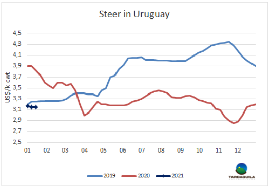 最近的降雨使報盤冷靜下來,市場找到了平衡。預定時間縮短,價格保持在上周的水平。育肥牛市場參考價保持與上周相近,但成交緩慢,預定時間拉長。預訂時間7-10天。特種閹牛參考價3.15美元/公斤,45天付款。母牛2.95美元/公斤,小母牛3-3.05美元/公斤。有個別成交可能高幾美分。市場上有人稱,上周有些工廠試圖保持采購價格下降的趨勢,閹牛想還3.1美元/公斤沒有買到。一些地區(qū)降雨鞥豐富給生產(chǎn)者帶來了平靜。預計下周二至周四將有更多降雨,因此1月結束時的降雨量將超過預期。預計市場將保持在目前的價格水平,除了從下周開始,一些工廠將開始進行481配額窗口的屠宰,其產(chǎn)品將從4月1日起進入歐洲市場??紤]到481配額的生產(chǎn)都是自養(yǎng)的?;蛞呀?jīng)獲得了牛源,481配額的集中生產(chǎn)減少了現(xiàn)貨市場上的購買壓力。