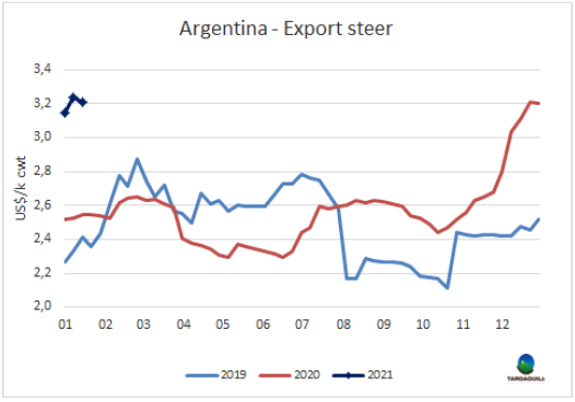 阿根廷政府在2020年最后一天宣布的為期兩個月的玉米出口禁令后取消了這一決策,改為限制每日3萬噸的出口配額,之后政府也取消了這一限制措施。然而,對于出口的擔憂仍然存在。今年是選舉年,政府將特別關注牛肉價格,在當前通貨膨脹的背景下,牛肉價格嚴重影響消費者價格指數(shù)在阿根廷人的文化中根深蒂固。與政府關系非常密切的經(jīng)濟學家們認為,必須通過加征出口稅將國內(nèi)價格與國外價格脫鉤,以至于與總統(tǒng)關系密切的副總統(tǒng)Fernanda Raverta稱阿根廷存在“出口食品的詛咒”。