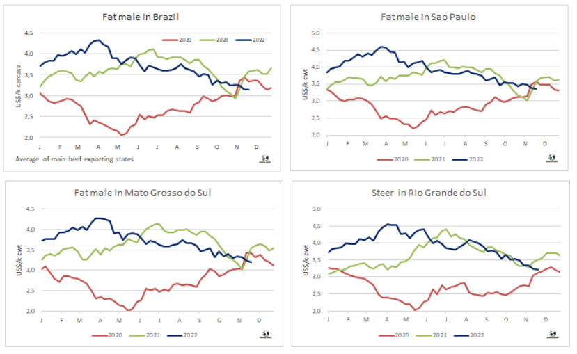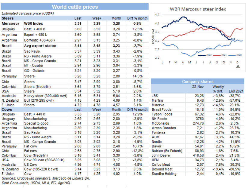 今年下半年,南美國家牛肉價格下跌,但谷物價格仍居高不下。這將導(dǎo)致南美國家減少育肥投入,從而導(dǎo)致2023年前幾個月育肥牛供應(yīng)下降。烏拉圭集約化養(yǎng)殖者協(xié)會(Aupcin)主席álvaro Ferrés告訴WBR,“有些人開始擔(dān)心2023年第一季度供應(yīng)減少。如果未來幾個月牛價上漲,育肥場的供應(yīng)狀況可能會改善,”從成本方面來看,由于動物飼料價格仍維持在高位,且雨后預(yù)備牛價格穩(wěn)定,預(yù)計不會出現(xiàn)大幅下降??紤]到草飼牛的銷售旺盛,直到年中,以及由于缺水而導(dǎo)致的牧草狀況不佳,Ferrés認(rèn)為“必須進(jìn)行谷飼育肥才能得到成品牛?!蹦厦赖貐^(qū)其他國家情況也類似。巴西方面,根據(jù)Cepea的說法,“目前的情況不適合圍欄牧場育肥?!卑⒏⒎矫?,“飼料場的現(xiàn)狀很差,”阿根廷育肥場協(xié)會(CAF)主席Fernando Storni告訴WBR。巴拉圭方面,近幾個月來育肥牛價格的暴跌導(dǎo)致飼養(yǎng)場每頭牛虧損100至200美元,因為架子牛的采購價格非常高。作為全球牛肉的主要供應(yīng)商,南方共同市場在2023年的頭幾個月可能會出現(xiàn)供應(yīng)減少,特別是牛齡較小的育肥牛。這是一個很重要的信息,因為巴西只能向中國出口屠宰時牛齡小于30個月的牛肉。