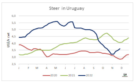 過去五周,南方共同市場待宰牛的均價基本保持穩(wěn)定,在3.28-3.31美元/公斤美元之間波動。上周,南方共同市場閹牛價格指數(shù)上漲了2美分,至3.31美元/公斤。巴西方面育肥牛雷亞爾價格有小幅上漲,但被0.7%的匯率跌幅逆轉(zhuǎn),主要出口市場育肥牛價格下跌了1美分至3.14美元/公斤。阿根廷方面,出口閹牛美元價格上漲2美分至3.6美元/公斤。烏拉圭本周牛價繼續(xù)上漲,與阿根廷參考價相當(dāng),3.6美元/公斤。巴拉圭待宰公牛價格保持3.2美元/公斤。
