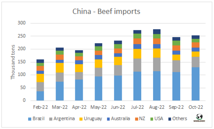 根據(jù)海關(guān)報告的數(shù)據(jù),中國10月進(jìn)口牛肉253,717噸,略高于9月5000噸,盡管低于7月和8月進(jìn)口量,7,8月進(jìn)口量超過27萬噸。10月進(jìn)口量中幾乎都是冷凍牛肉,冰鮮牛肉只有3902噸。在249,816噸冷凍牛肉中,30,689噸是帶骨牛肉,平均進(jìn)口價格為3,291美元/噸,218,666噸是去骨牛肉,平均進(jìn)口價格為6,884美元/噸。帶骨牛肉的主要供應(yīng)國是烏拉圭,約9087噸,平均價格2982美元/噸。去骨冷凍牛肉的主要供應(yīng)國是巴西,約130168噸,平均價格6,681美元/噸。此外,牛副到港量2392噸,烏拉圭也是主要供應(yīng)國,從烏拉圭進(jìn)口約781噸。盡管從澳洲出口量減少,考慮到9月和10月從南方共同市場發(fā)貨的數(shù)量,預(yù)期11月的牛肉進(jìn)口量仍然很大, 11月進(jìn)口量可能略低于10月。