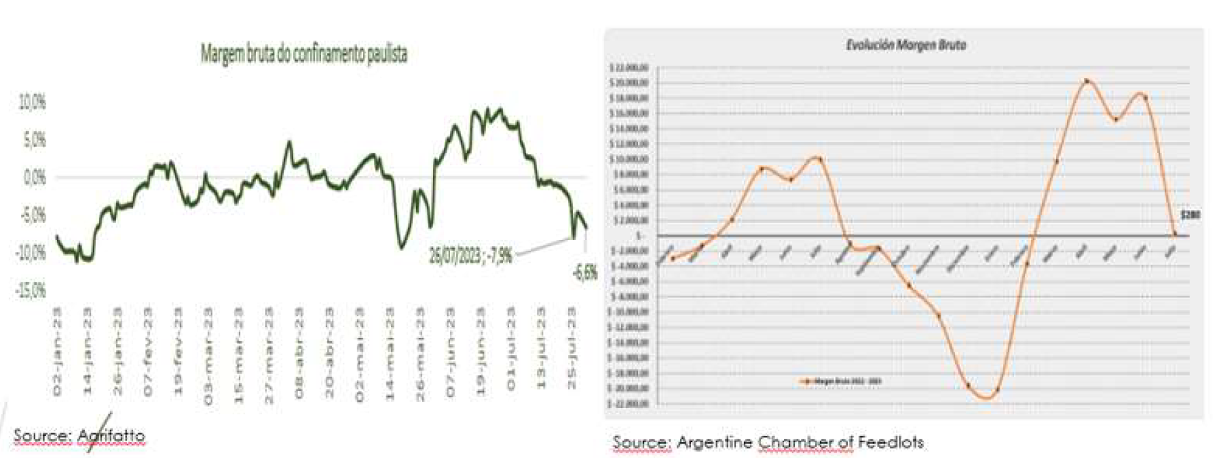 一位分析師稱,適合出口到中國(guó)的牛可能會(huì)減少,但無(wú)論如何,供應(yīng)都不會(huì)減少,飼養(yǎng)場(chǎng)的牛數(shù)量將達(dá)到700萬(wàn)頭。在圣保羅,飼養(yǎng)場(chǎng)7月份的數(shù)字為負(fù)數(shù),26日達(dá)到7.9%。盡管玉米價(jià)格明顯下降,牛的價(jià)格保持相對(duì)較低,被送往屠宰場(chǎng)牛的價(jià)格下跌使數(shù)字變紅。阿格里法托說(shuō):“隨著10月23日育肥牛的價(jià)格將降至249雷亞爾/15公斤以下,超過(guò)了過(guò)去60天16%的成本下降,飼養(yǎng)場(chǎng)毛利率顯示負(fù)數(shù)。因此,預(yù)計(jì)10月和11月屠宰的動(dòng)物數(shù)量會(huì)減少是合理的。