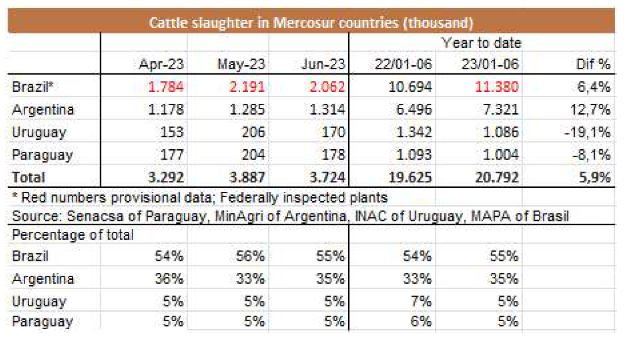 一位貿(mào)易商預(yù)測(cè),由于進(jìn)入飼養(yǎng)場(chǎng)的牛數(shù)量減少,導(dǎo)致阿根廷工業(yè)屠宰量減少,2023年下半年南方共同市場(chǎng)國(guó)家出口到中國(guó)的牛肉供應(yīng)量將減少。