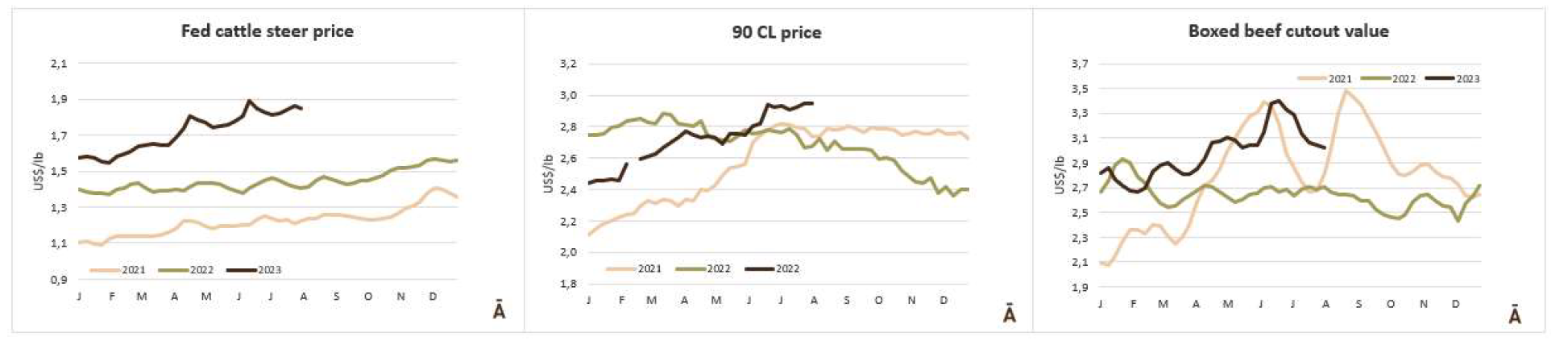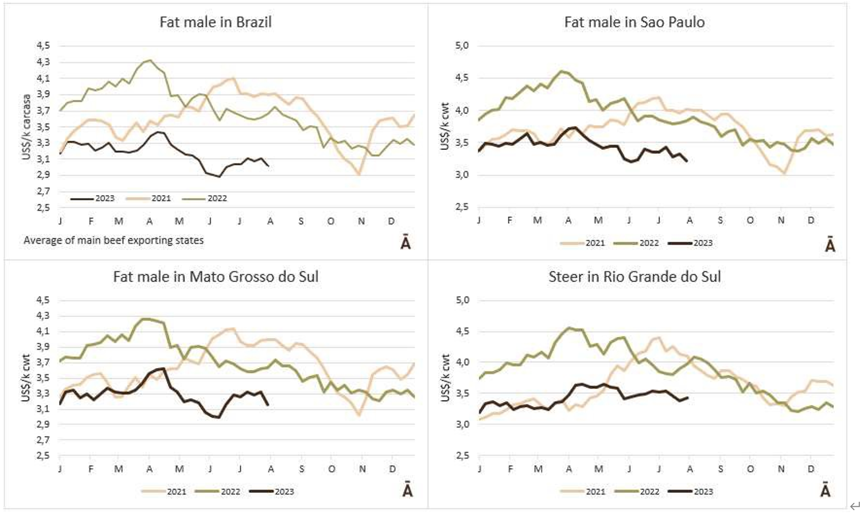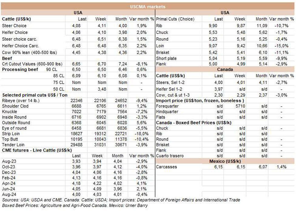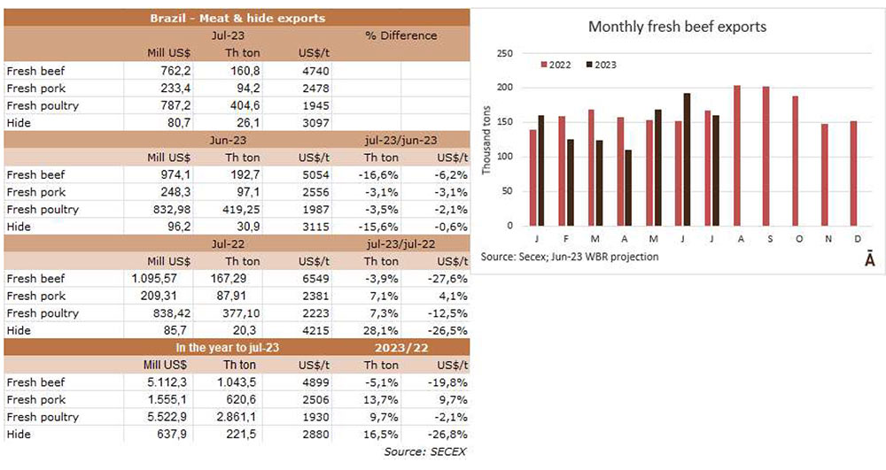 根據(jù)外貿(mào)部(SECEX)的信息,巴西7月份出口了160795噸牛肉,平均價(jià)值為4740美元/噸。與6月份相比,產(chǎn)量減少了近3.2萬(wàn)噸,但同比僅減少了6.5萬(wàn)噸。平均出口價(jià)格在月度比較中下降6.2%,在年度比較中下降27.6%。因此,與去年同月相比,巴西的出口量在5月和6月出現(xiàn)了復(fù)蘇。今年至7月份,巴西出口了104萬(wàn)噸牛肉,比2022年同期減少了5.6萬(wàn)噸(-5.1%);與每噸4899美元相比,平均出口價(jià)格下降了20%。