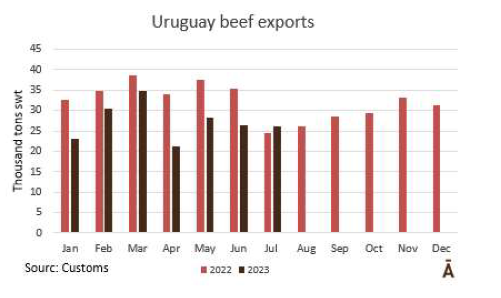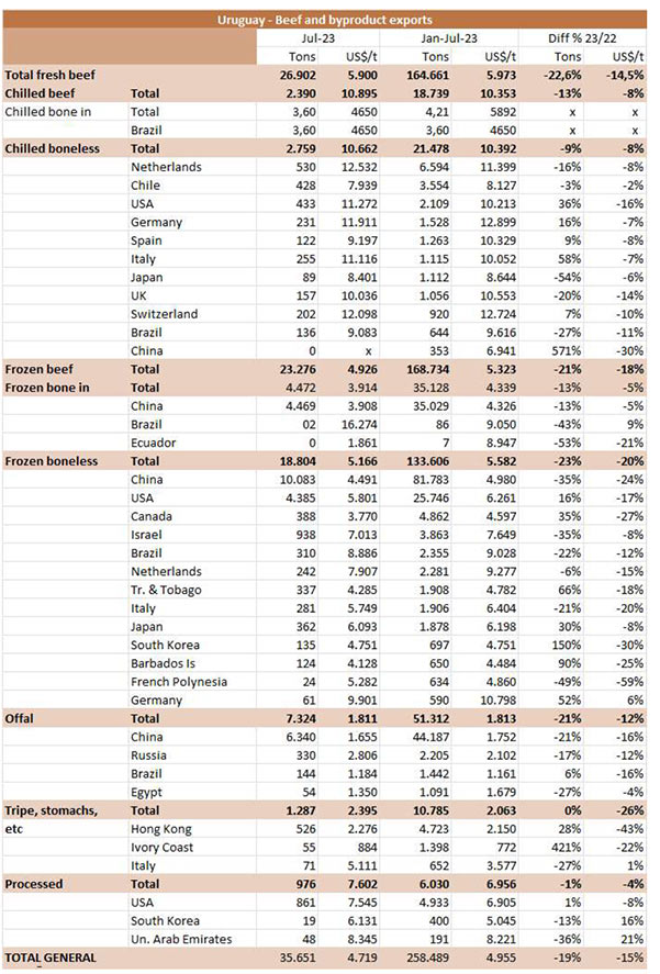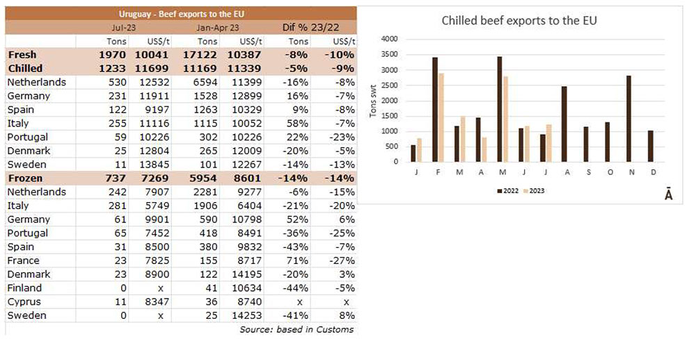 在截至7月的一年中,烏拉圭向歐盟國(guó)家出口了17122噸牛肉,比2022年同期減少了8%。主要是冷凍食品的下降,為14%, 冰鮮產(chǎn)品下降了5%。