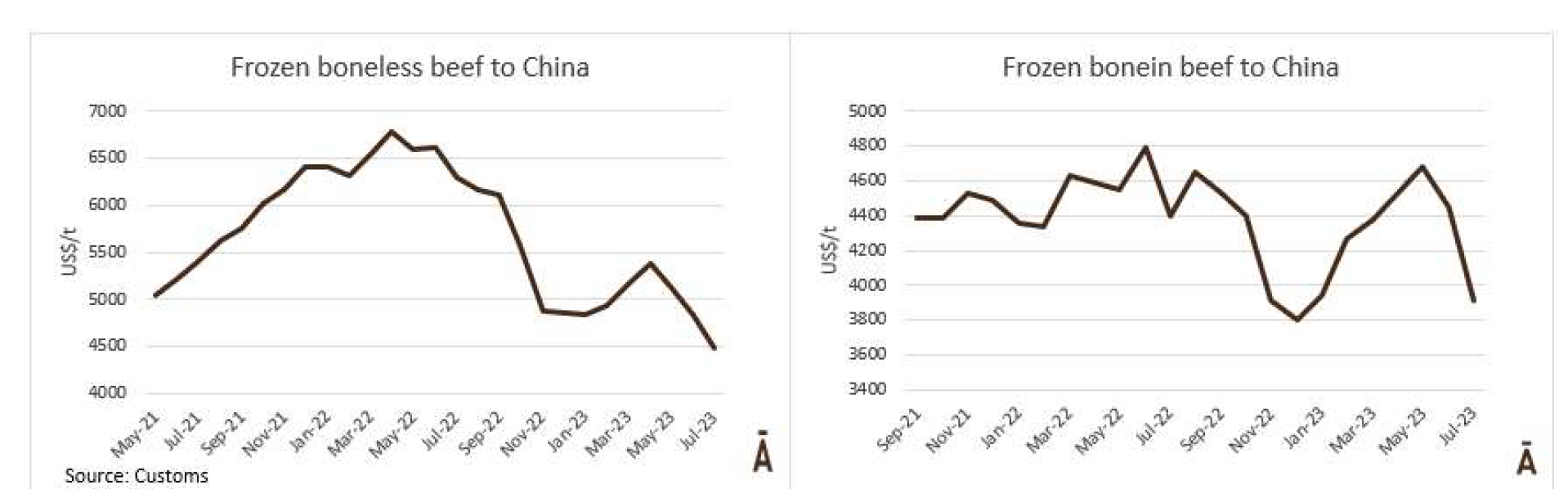 7月份,出口中國(guó)的帶骨牛肉為4469噸,平均價(jià)格是3914美元/噸。去無(wú)骨牛肉為10083噸,平均價(jià)格為4491美元/噸,這個(gè)月的價(jià)格有一個(gè)暴跌。出口中國(guó)的冷凍牛肉平均價(jià)格為4312美元/噸,為9個(gè)月前2021年2月以來(lái)的最低值。在截至7月的累計(jì)一年中去骨牛肉下降了35%,帶骨牛肉下降了13%。